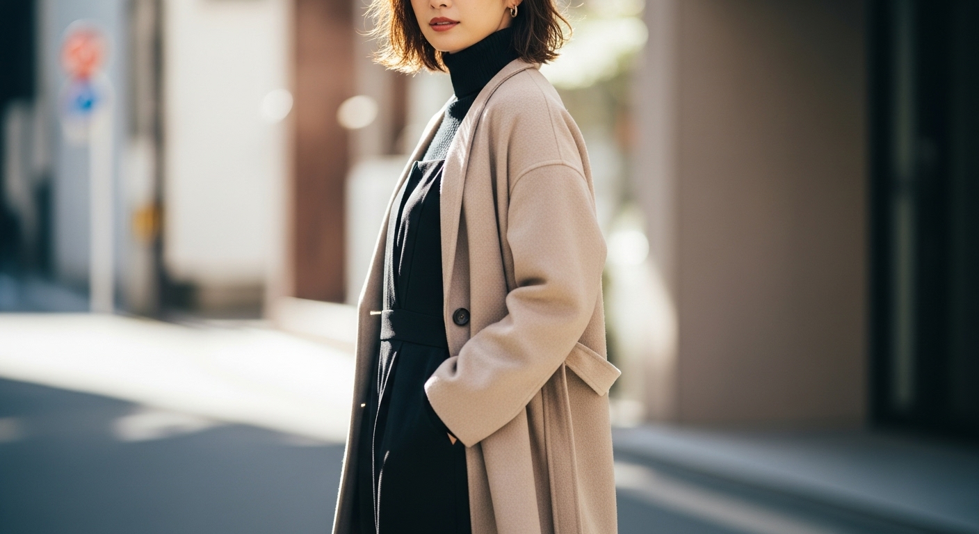 冬はロングコートを合わせると、縦のラインが強調されてスタイルアップ効果が高まります!