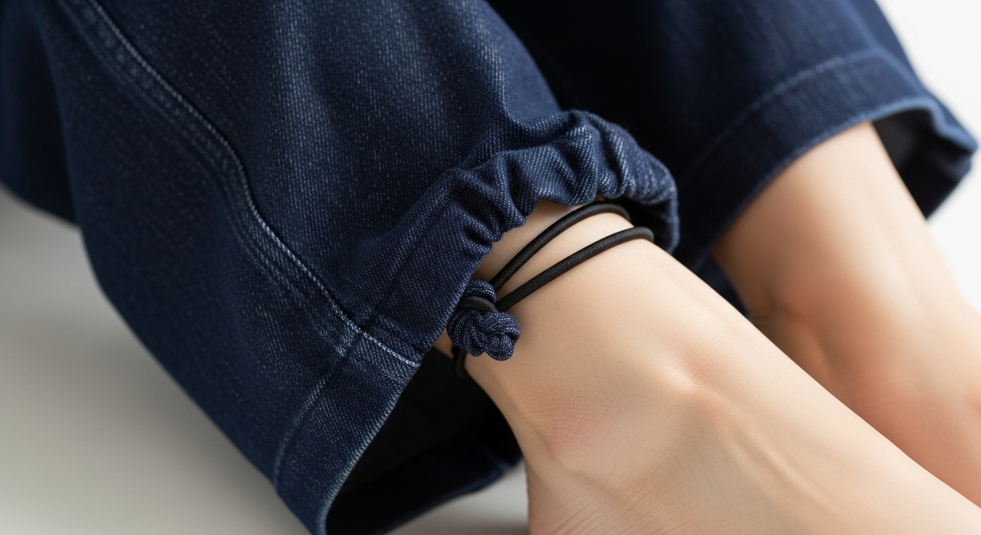 ヘアゴムを足首あたりに2つ用意し、両足の裾をそれぞれ留めます。