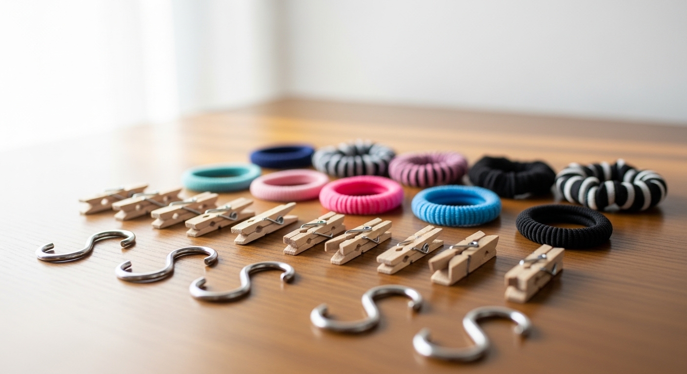 ヘアゴムや洗濯バサミでまとめるのが、最も確実でしょう。