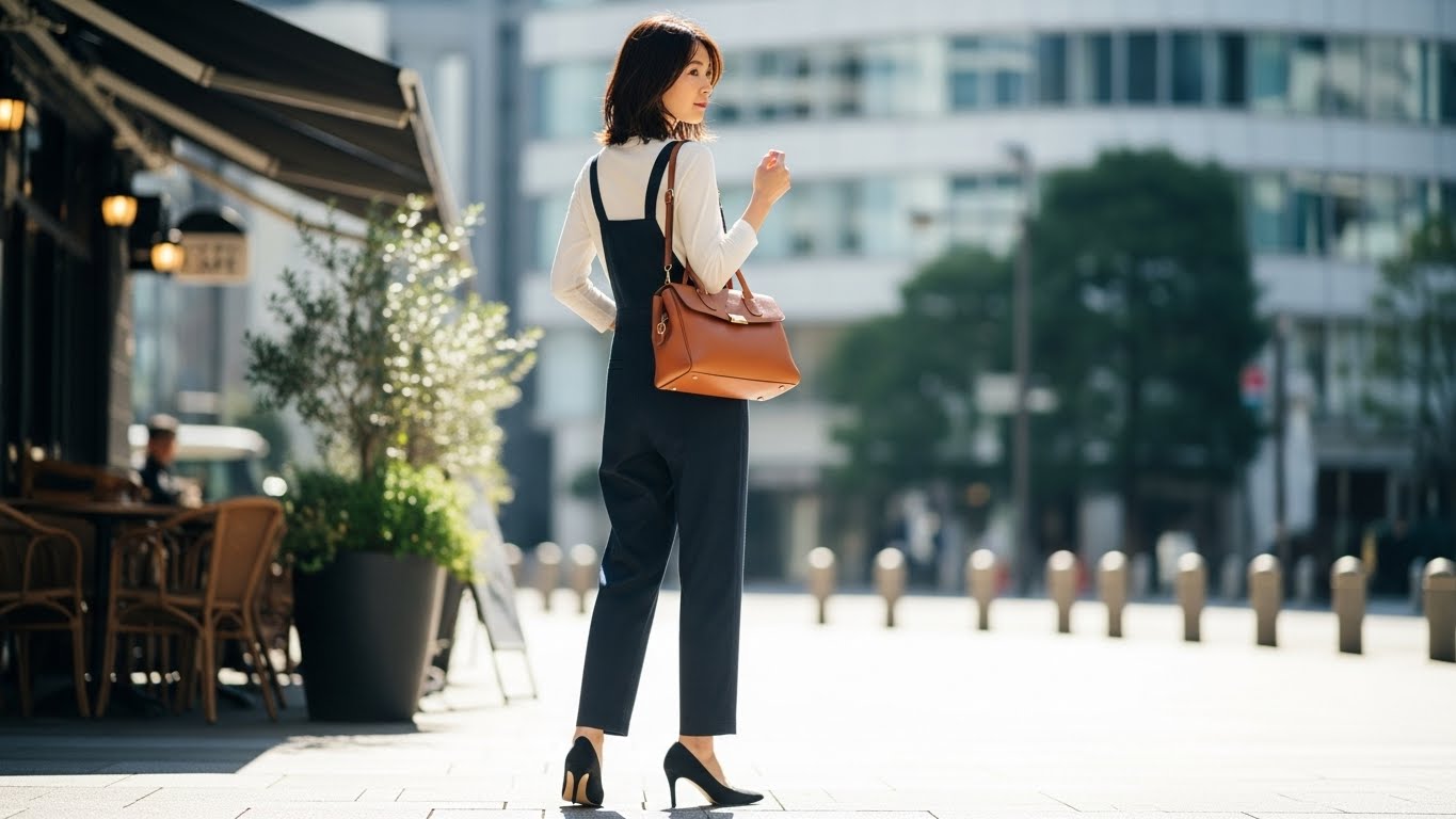 きれいめ素材のサロペットに、ブラウスやパンプスを合わせて。