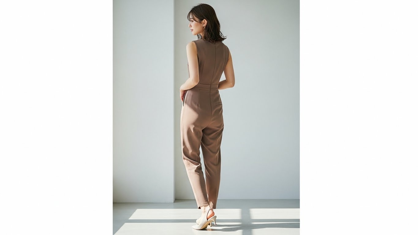 深めのVネックで首元すっきり、テーパードシルエットで脚長効果も◎