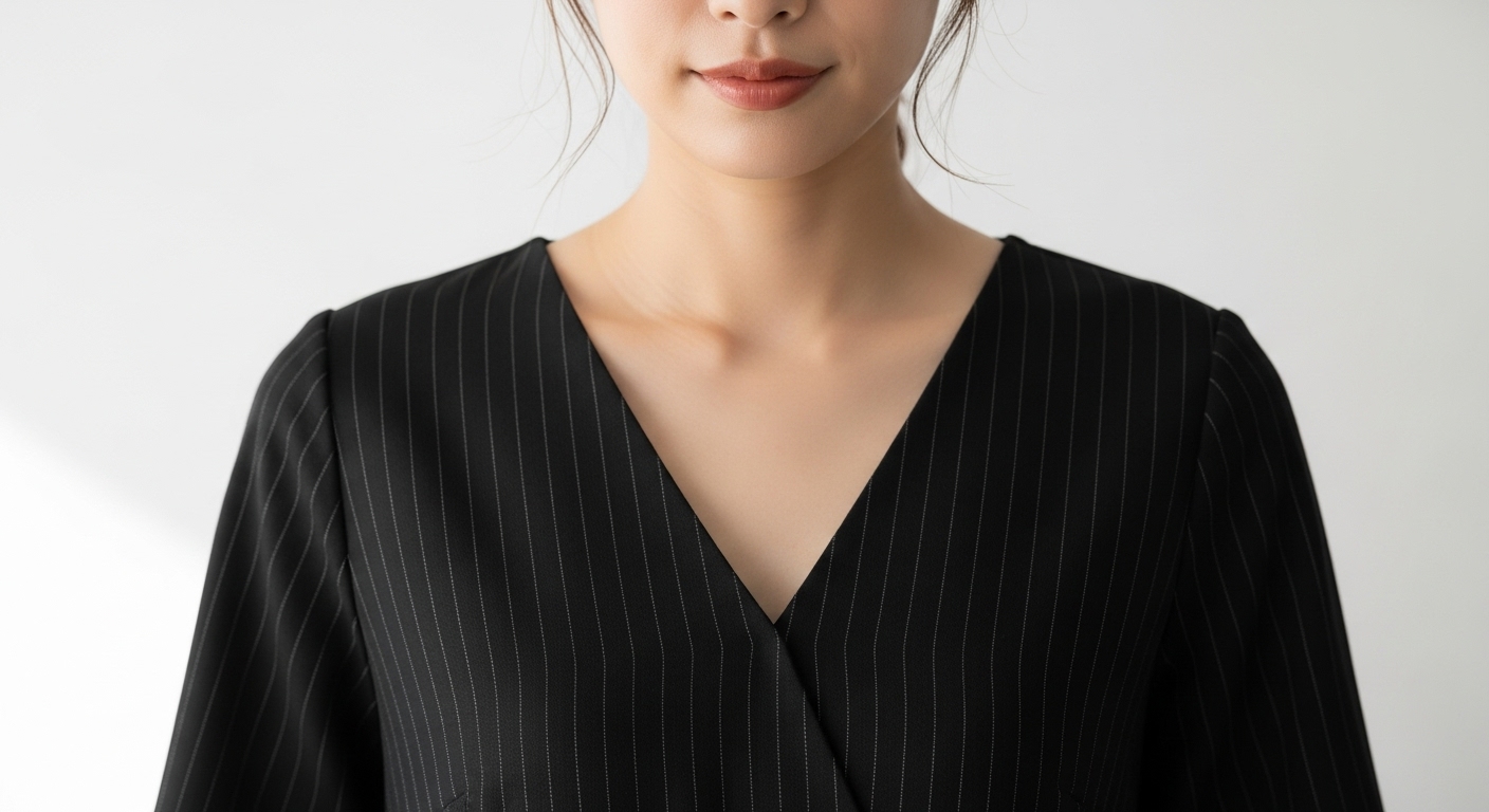 首元のV字ラインが視線を縦に誘導し、着痩せ効果を生み出します