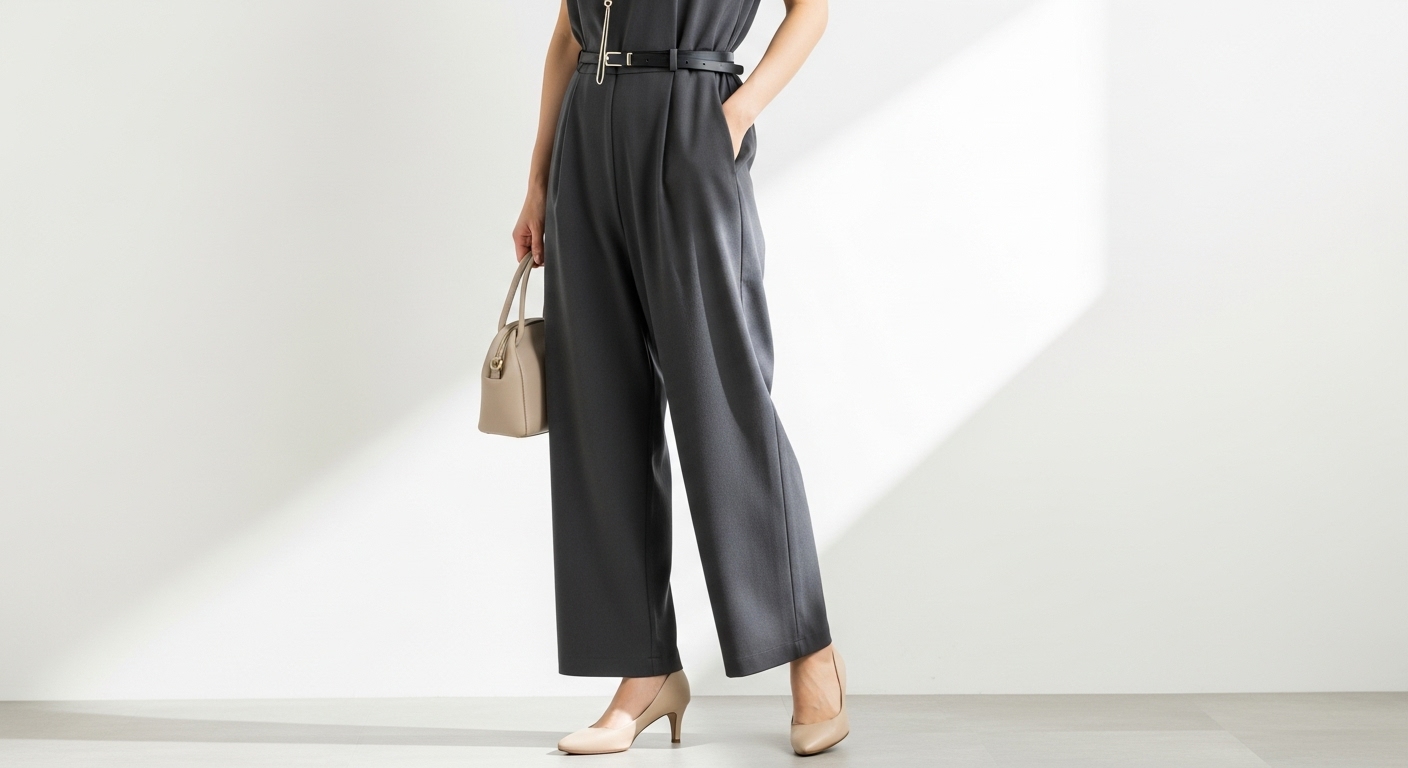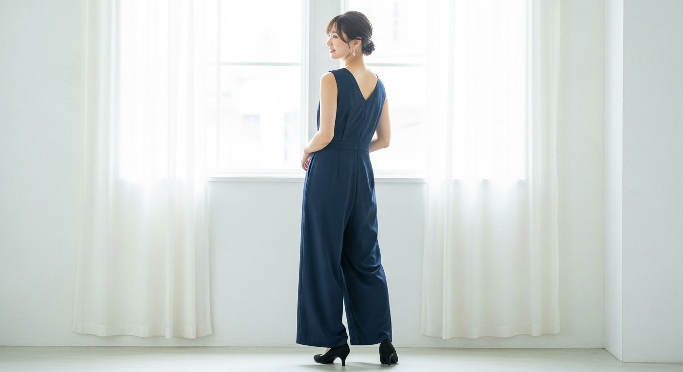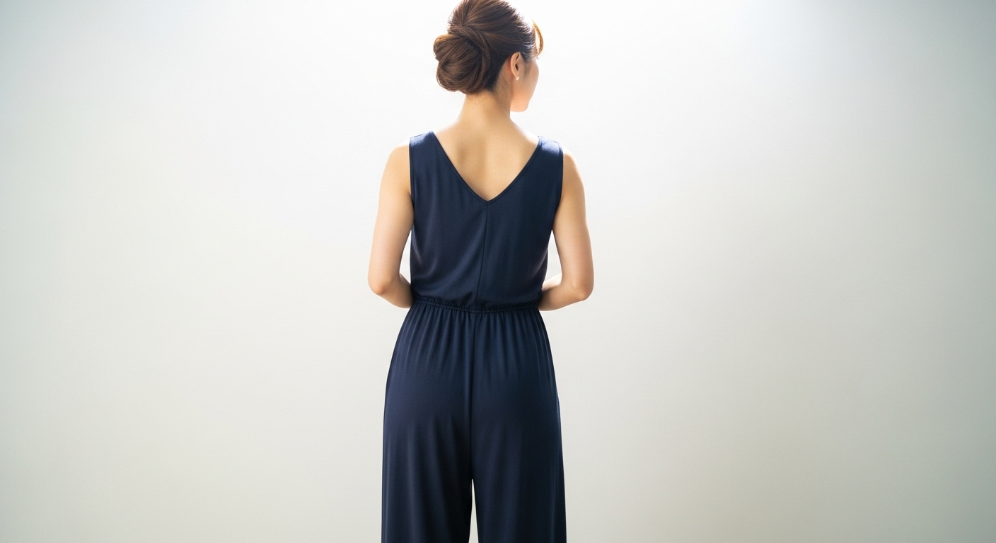 落ち感素材、Vネック、濃色という3つのポイントを押さえれば、誰でもオールインワンを着こなせます。