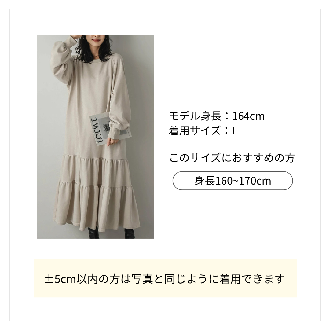 ふんわり優しいシルエットが特徴的なスウェットワンピースです。 段々に広がるティアードデザインで女性らしさを引き立てます。 袖にボリュームを持たせたデザインでオールインワンコーデが完成します。