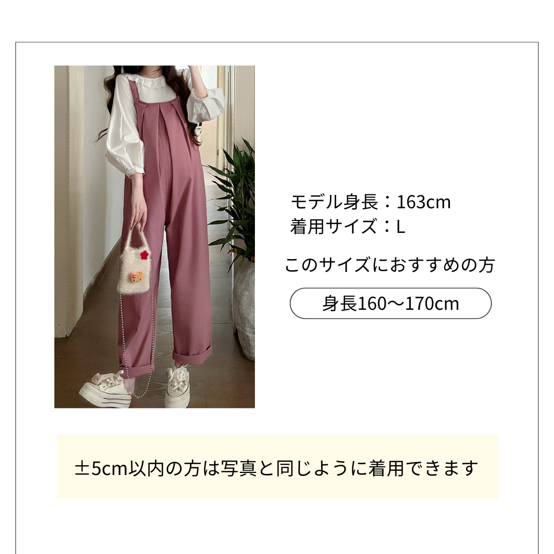 オールインワンコーデが楽しめる上品なパンツサロペット。 白いフリル襟のブラウスと組み合わせた大人かわいいデザイン。 広がりのあるシルエットで動きやすく、ふわもこバッグとの相性も抜群です。