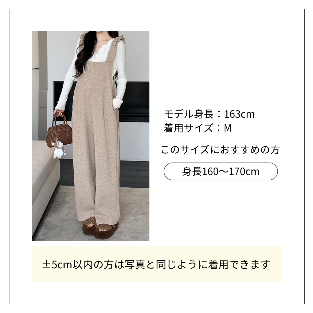 肩フリルとゆったりとしたワイドパンツが特徴。長めの丈感とリラックス感ある着心地で、カジュアルな中にも上品な雰囲気のオーバーオールです。