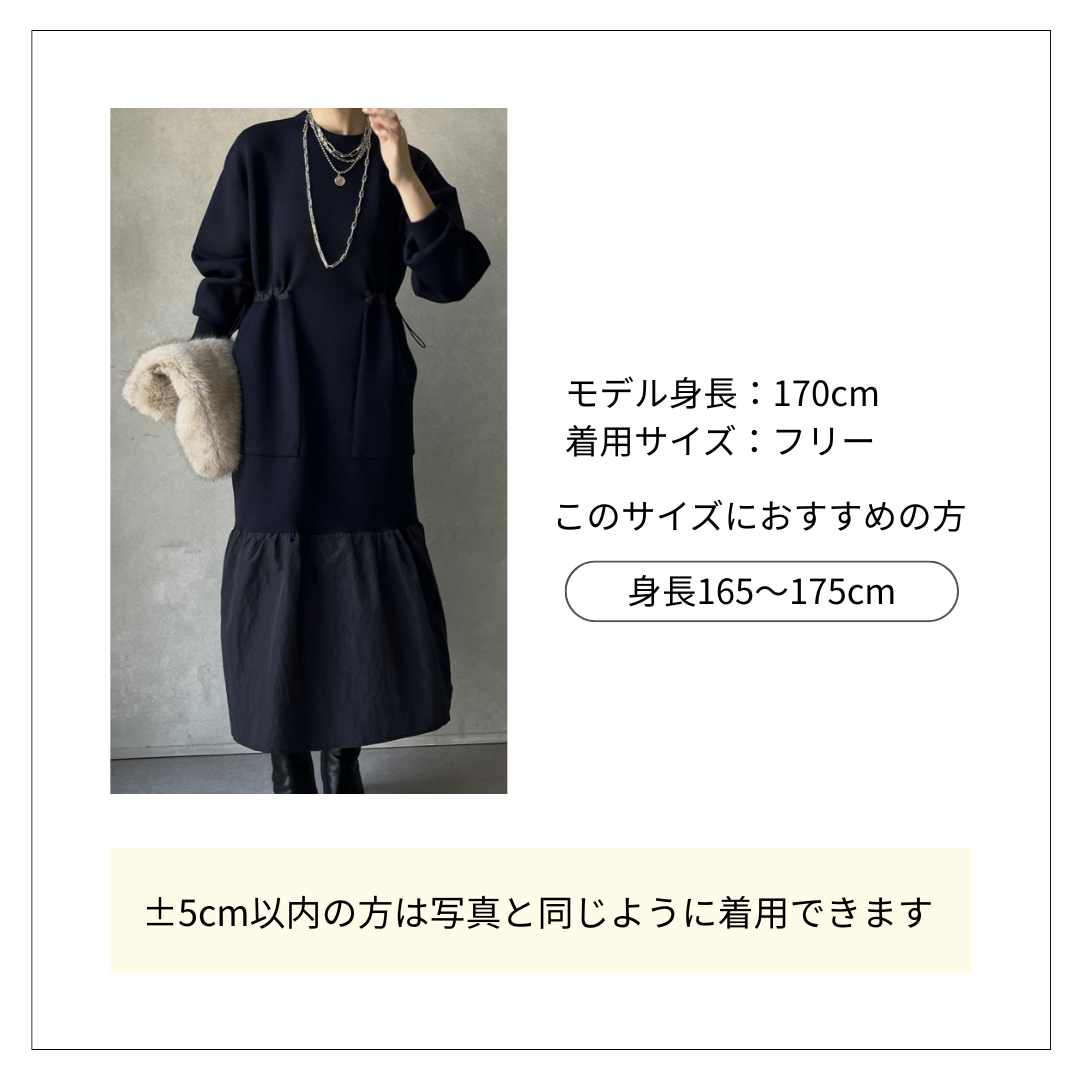 スウェット素材と異素材を組み合わせた裾フリルが特徴的なオールインワンコーデにぴったりのワンピース。 ゆったりとしたシルエットと大きなポケットが使いやすく、一枚でおしゃれに決まるオールインワンコーデが完成します。 裾の切替デザインがこなれ感を演出する一枚です。