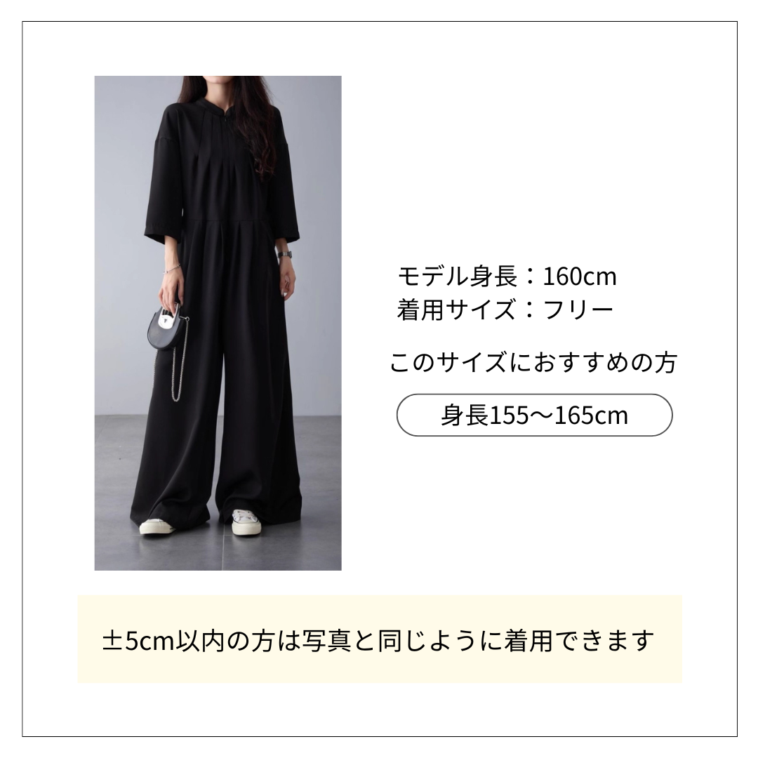 落ち着いた雰囲気が魅力のオールインワン(コンビネゾン)です。 七分袖のゆったりとした身頃とワイドなパンツラインが、リラックス感と洗練された印象を両立。 オールインワンコーデの主役として、小物使いで表情を変えられる万能アイテムです。