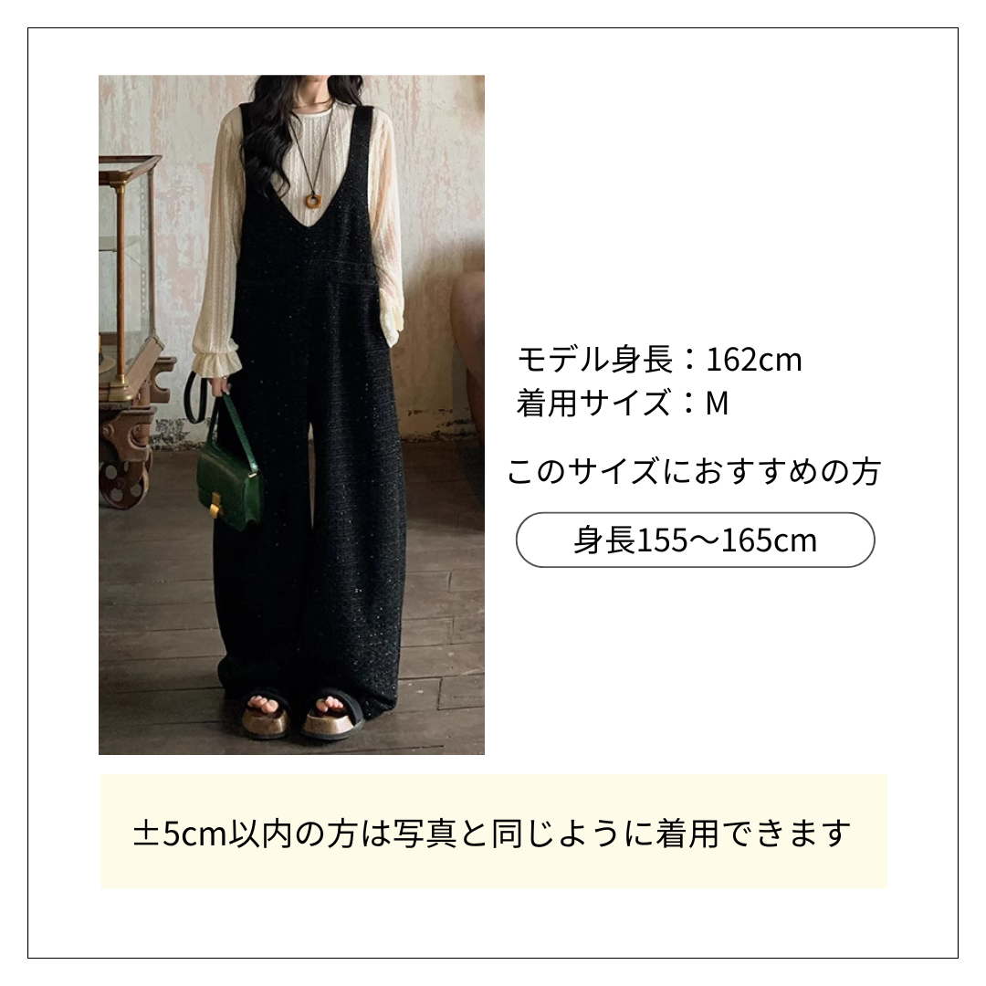 上品なツイード風素材が特徴的なオールインワン(コンビネゾン)です。 ゆったりとしたワイドシルエットで体型カバーも叶い、様々なインナーと合わせられる着回し力抜群の一着。 オールインワンコーデの主役として、一枚でこなれた雰囲気を演出できます。