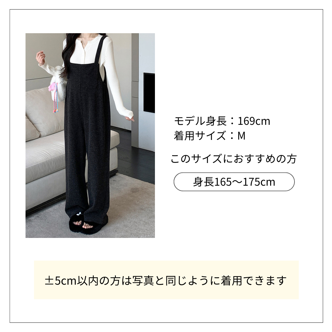 白のリブニットトップスと一体化したサロペットタイプのオールインワン(コンビネゾン)です。 ゆったりとしたワイドシルエットで体型カバーも叶い、リラックス感のあるオールインワンコーデが完成します。 肩紐で調節可能なデザインで、着回し力抜群の一着です。