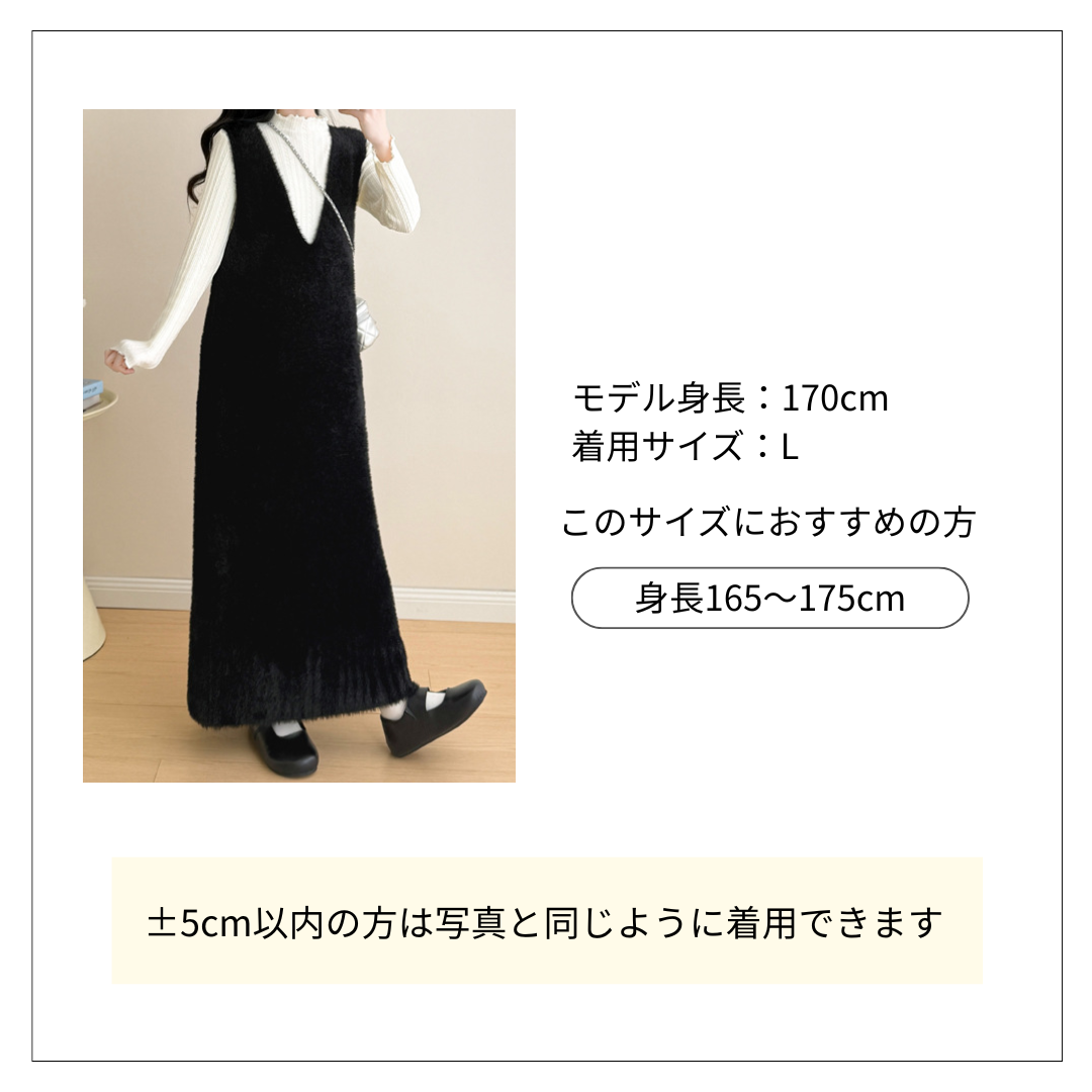 上品な深Vネックデザインが印象的な黒のニットジャンパースカート風オールインワン(コンビネゾン)です。 白のリブタートルニットとレイヤードスタイルで、オールインワンコーデを優雅に演出します。 裾のふわふわとした質感がフェミニンな雰囲気を醸し出し、大人可愛いスタイリングが完成します。