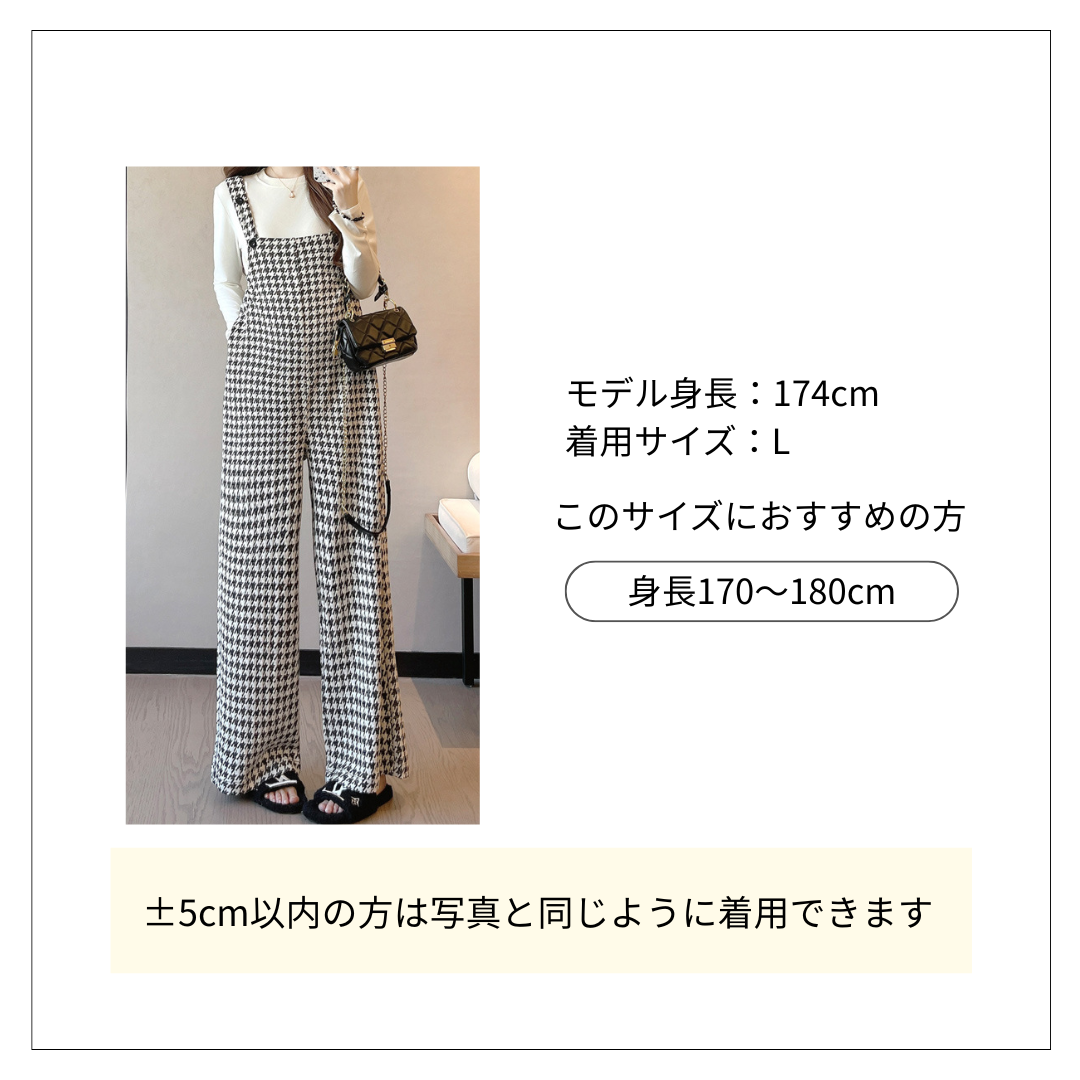 クラシカルな千鳥格子柄が目を引くサロペットパンツと白ニットの組み合わせが上品なオールインワンコーデ。 ワイドシルエットで体型カバーも叶う、大人可愛いオールインワン(コンビネゾン)です。 肩紐のデザインがアクセントになり、着回し力抜群の一着です。