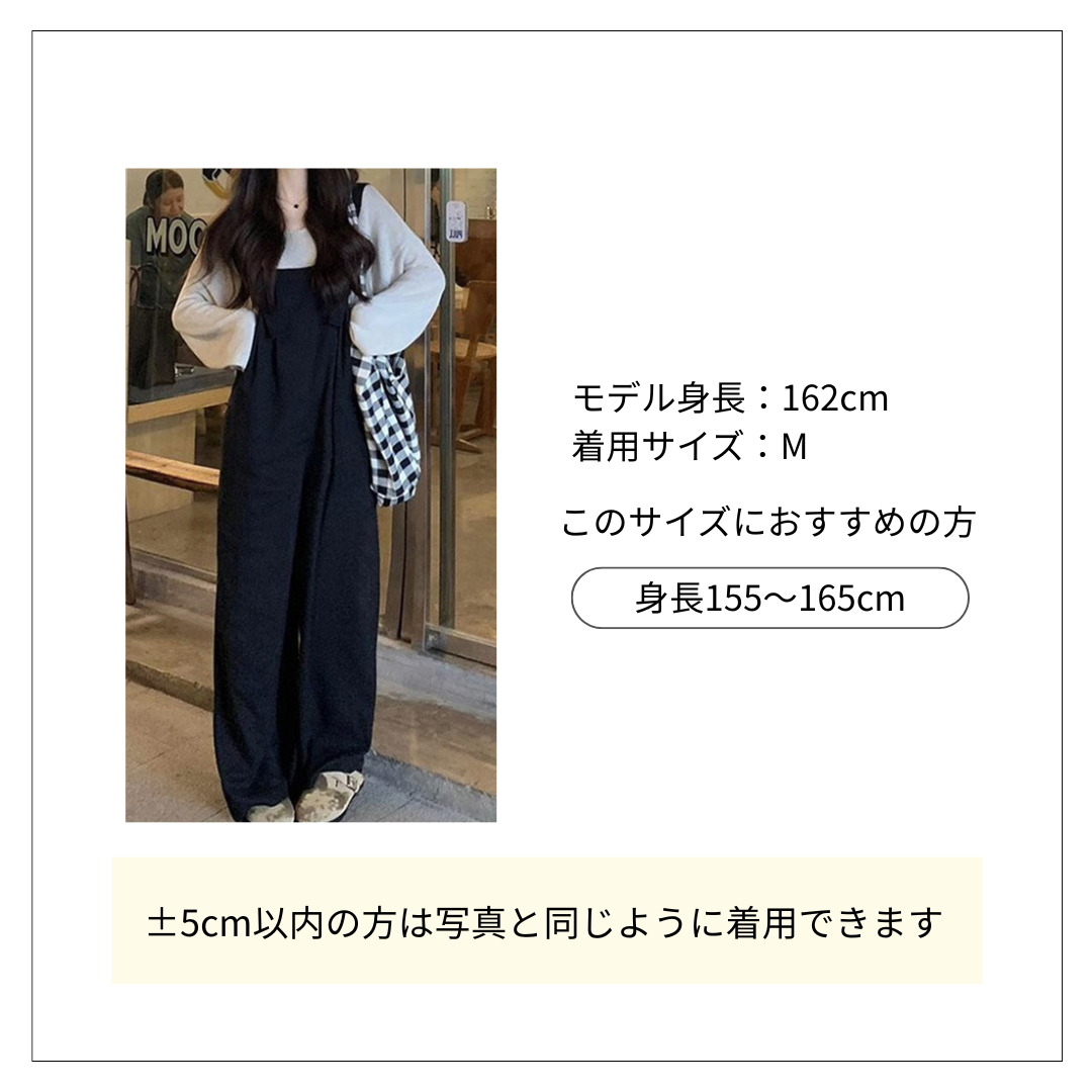 白の長袖トップスと黒のサロペットが一体になったオールインワン(コンビネゾン)です。 ゆったりとしたワイドシルエットで体型カバーも叶い、カジュアルながら上品な雰囲気を演出します。 チェック柄のアイテムを巻いてアクセントをつけた、こなれ感のあるオールインワンコーデが完成します。