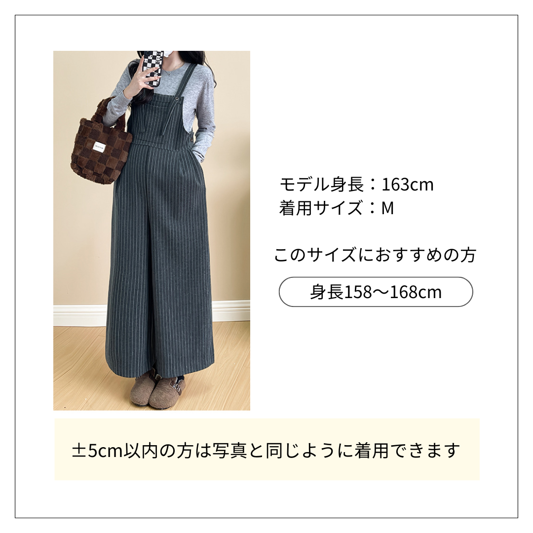細めの縦縞が上品な印象を与えるサロペットタイプのオールインワン(コンビネゾン)です。 ゆったりとしたワイド丈が体型をカバーしながら、長袖トップスとの重ね着で幅広いシーズンに対応。 カジュアルにもきれいめにも決まるオールインワンコーデが楽しめます。