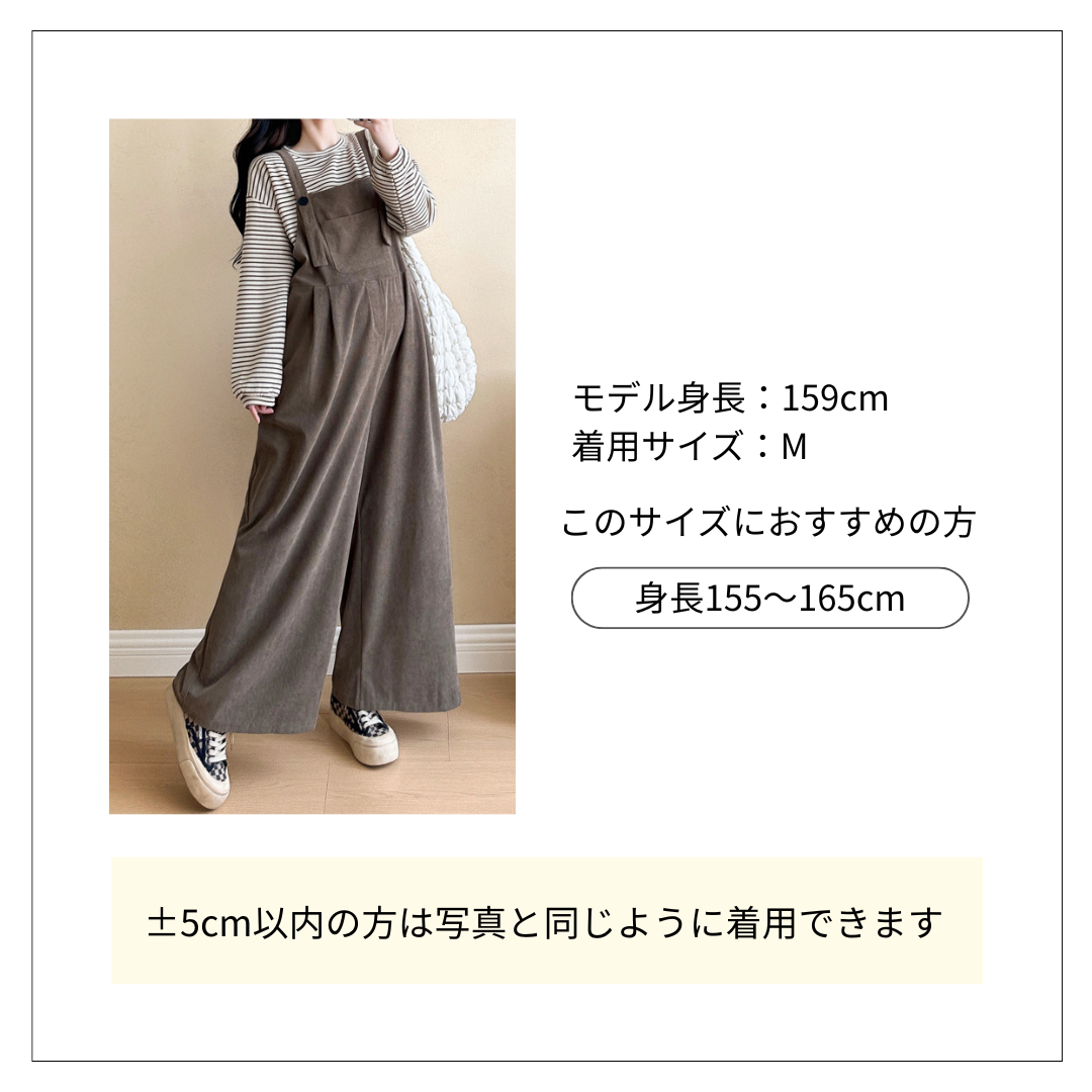 ゆったりとしたシルエットが魅力的なサロペットと横縞長袖上着の組み合わせ。 オールインワンコーデとして一枚で着映えするオールインワン。 幅広のパンツと肩紐のデザインが体型をカバーしながら、こなれ感を演出します。