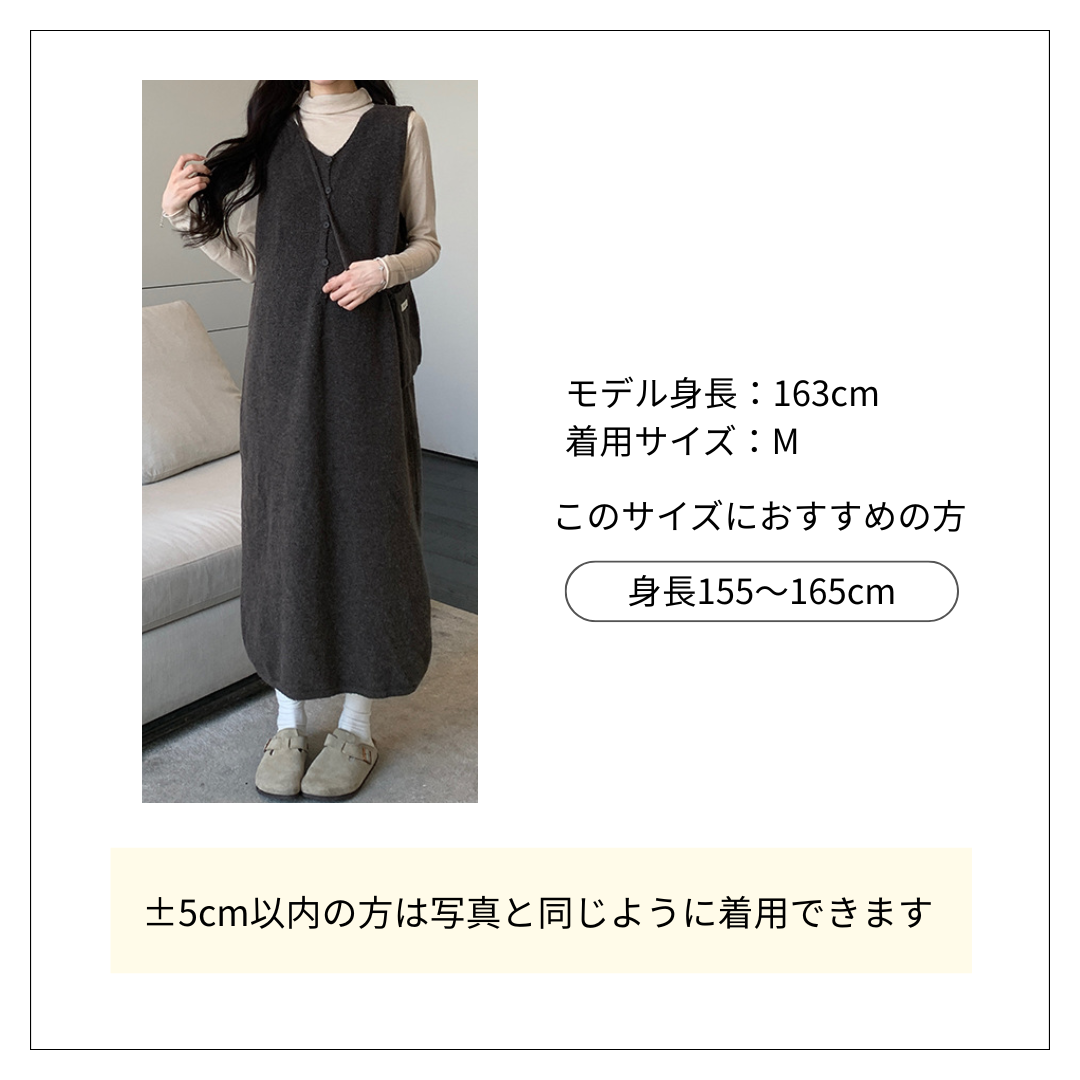 黒のタートルネックとのレイヤードスタイルが楽しめるオールインワンコーデのスカートタイプです。 ゆったりとした着心地とマキシ丈のシルエットで体型カバーも叶います。 ボタン開閉で着脱しやすく、秋冬にぴったりの一枚です。