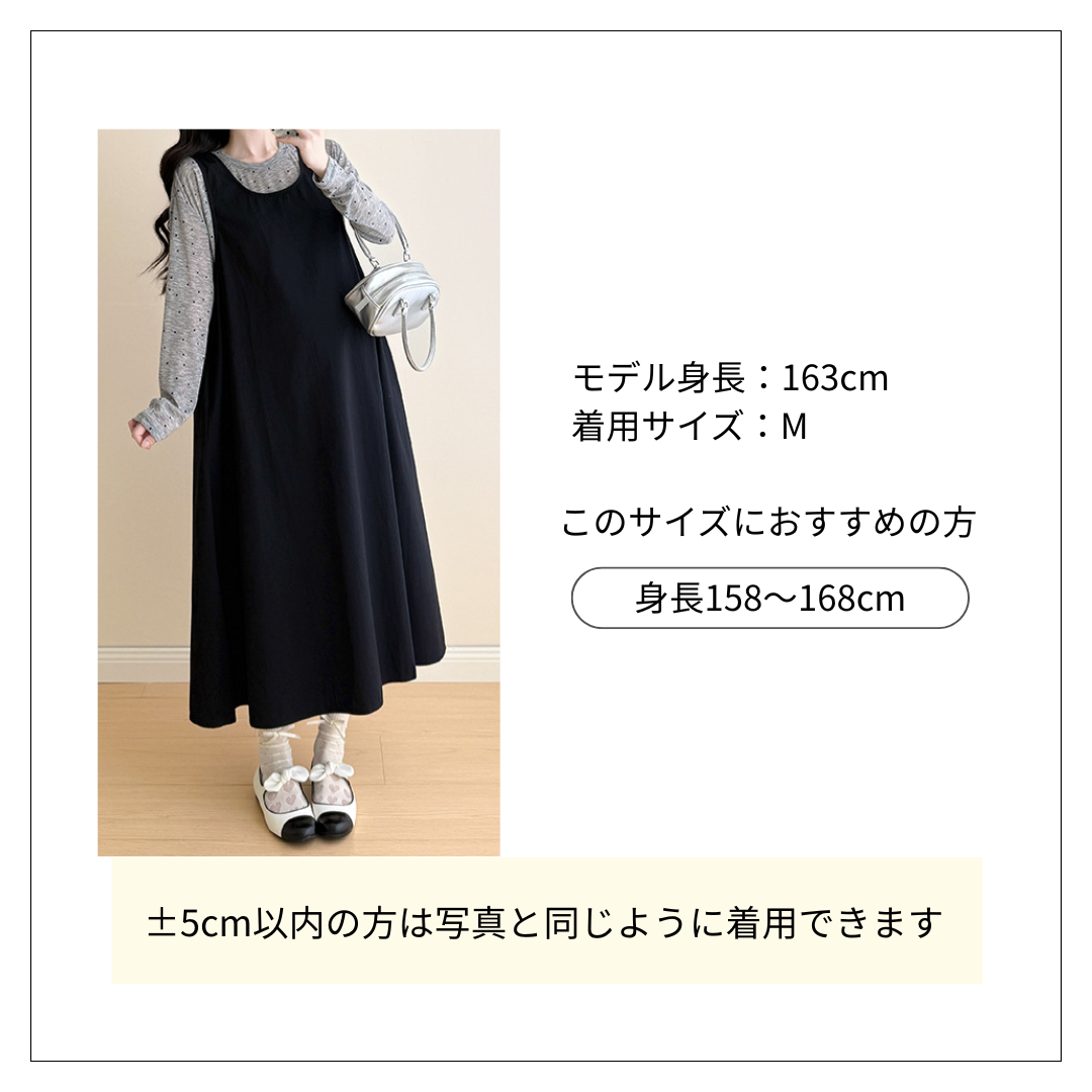 黒のジャンパースカートと長袖トップスの重ね着風オールインワンコーデです。 スカートタイプで女性らしさを演出しながら、一枚で着映えする便利なアイテム。 落ち感のある生地が体型をカバーし、カジュアルからお出かけまで幅広く活躍します。