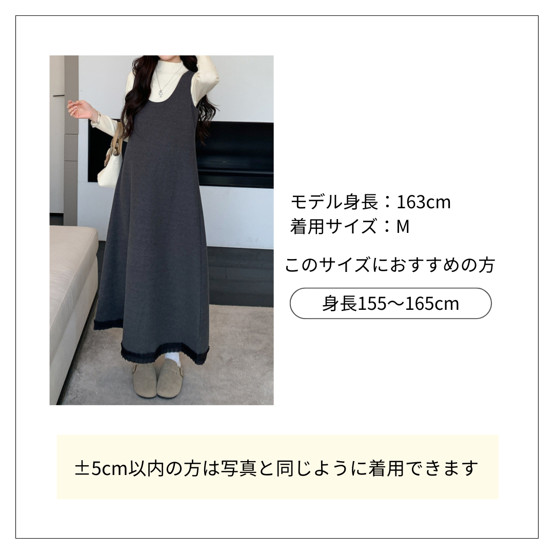 タートルニットとの重ね着が決まるスカートタイプのオールインワンコーデ。 ゆったりとしたAラインシルエットで体型カバーも叶います。 裾の配色デザインがアクセントになり、さりげなくおしゃれな印象に仕上がる一着です。