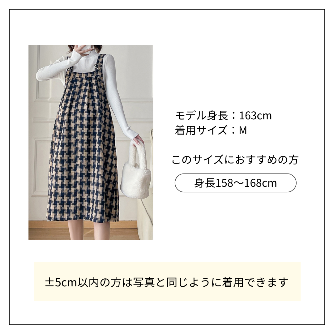 クラシックな千鳥格子柄が上品な印象を与えるオールインワンコーデのスカートタイプ。 肩紐には高級感のある金具装飾が施され、アンサンブル風の着こなしが楽しめます。 ハイウエストデザインでスタイルアップ効果も抜群の一着です。
