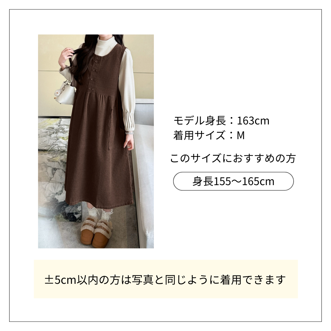 秋冬にぴったりのコーデュロイ素材のジャンパースカートとタートルニットのオールインワンコーデです。 スカートタイプはフロントのボタンデザインとギャザーが可愛らしく、ゆったりとしたシルエットで着心地も抜群。 ヘアバンドを合わせてレトロで優しい雰囲気に仕上げた大人可愛いスタイルです。