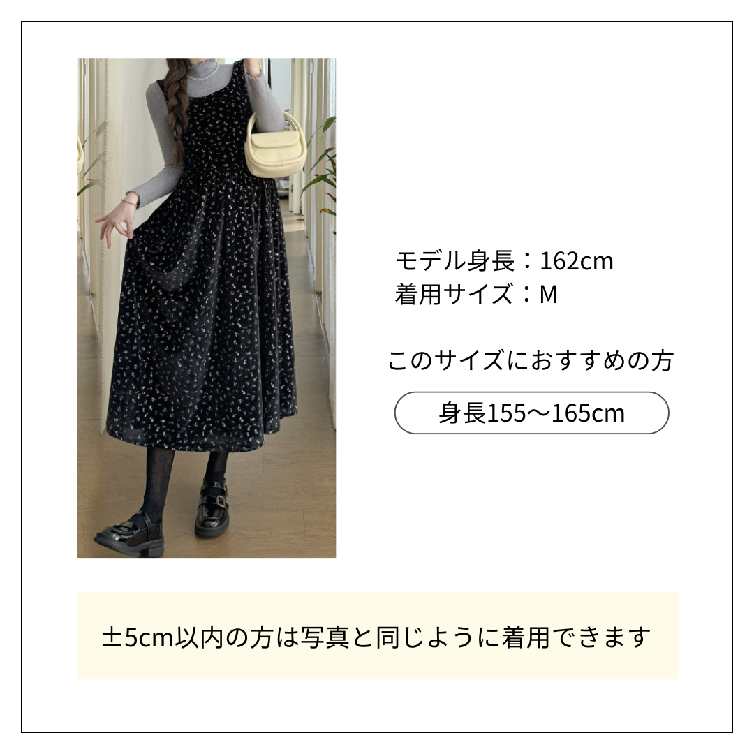 グレーのタートルネックに黒の小花柄吊りスカートを合わせたオールインワンコーデです。 スカートタイプのワンピースは裾に向かって優雅に広がるシルエットが特徴的。 細かな花柄が上品で、重ね着スタイルで季節を問わず着回せる万能アイテムです。