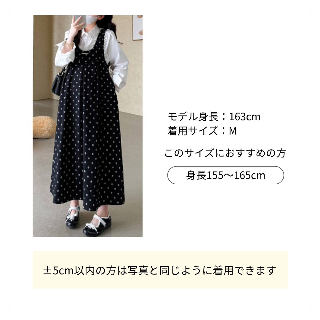 大人可愛い水玉柄のジャンパースカートと白ブラウスの二点セット。 オールインワンコーデで着映え抜群のスカートタイプです。 ゆったりシルエットで体型カバーも叶い、マタニティとしても活躍します。 上品なドット柄で、デイリーからお出かけまで幅広くご着用いただけます。